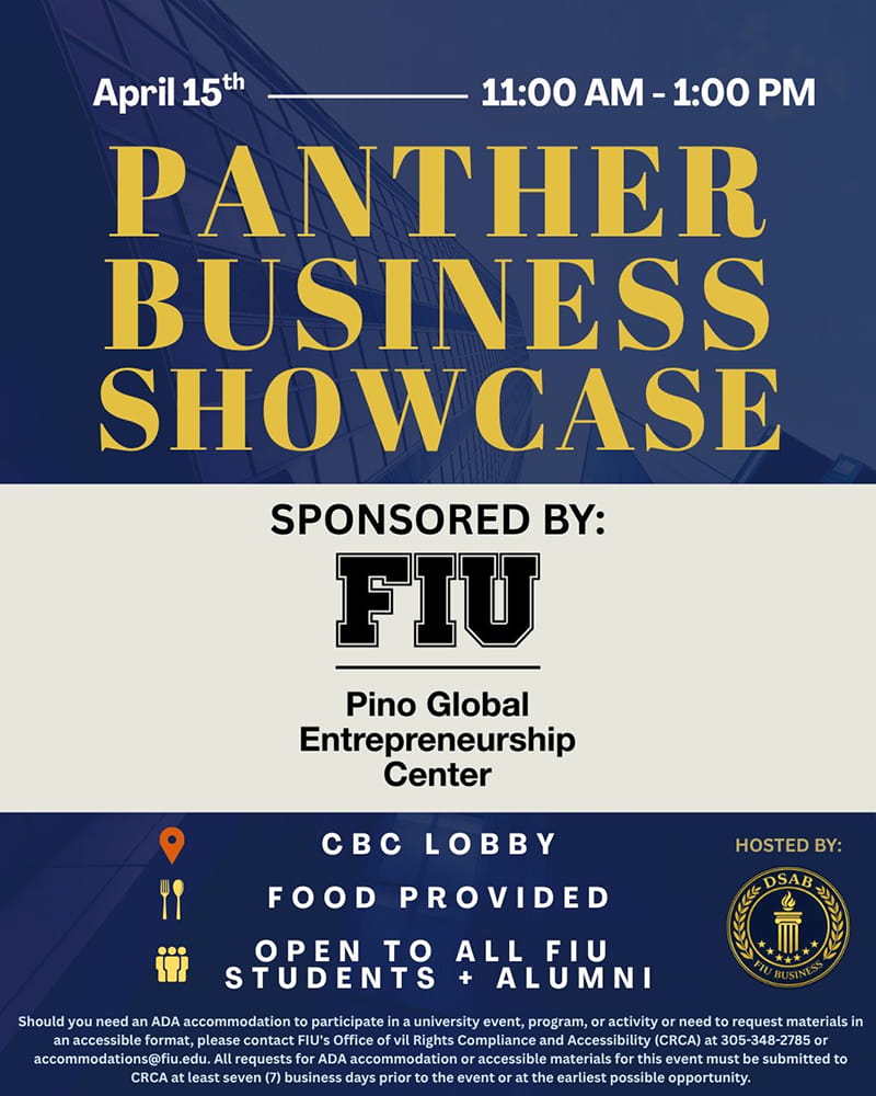Should you need an ADA accommodation to participate in a University event, program, or activity or need to request materials in an accessible format, please contact FIU's Office of Civil Rights (OCR) at 305-348-2785 or accommodations@fiu.edu. All requests for ADA accommodation or accessible materials for this event must be submitted to OCR at least seven (7) business days prior to the event or at the earliest possible opportunity.